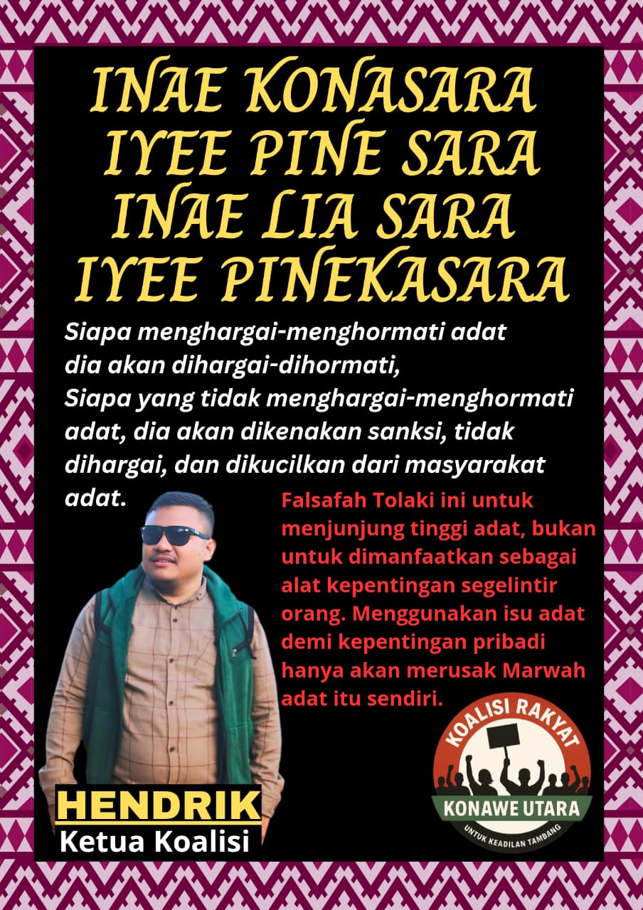 Dalam pandangan Koalisi, salah satu falsafah luhur Suku Tolaki sangat relevan untuk mengingatkan semua pihak: “INAE KONA SARA – IYEE PINESARA, INAE LIA SARA – IYEE PINEKASARA”. Artinya, “Siapa yang menghargai-menghormati adat, dia akan dihargai. Siapa yang tidak menghargai-menghormati adat, dia akan dikenakan sanksi dan dikucilkan dari masyarakat adat.” Falsafah ini adalah pilar moralitas adat Tolaki yang diwariskan untuk menjaga kehormatan bersama.