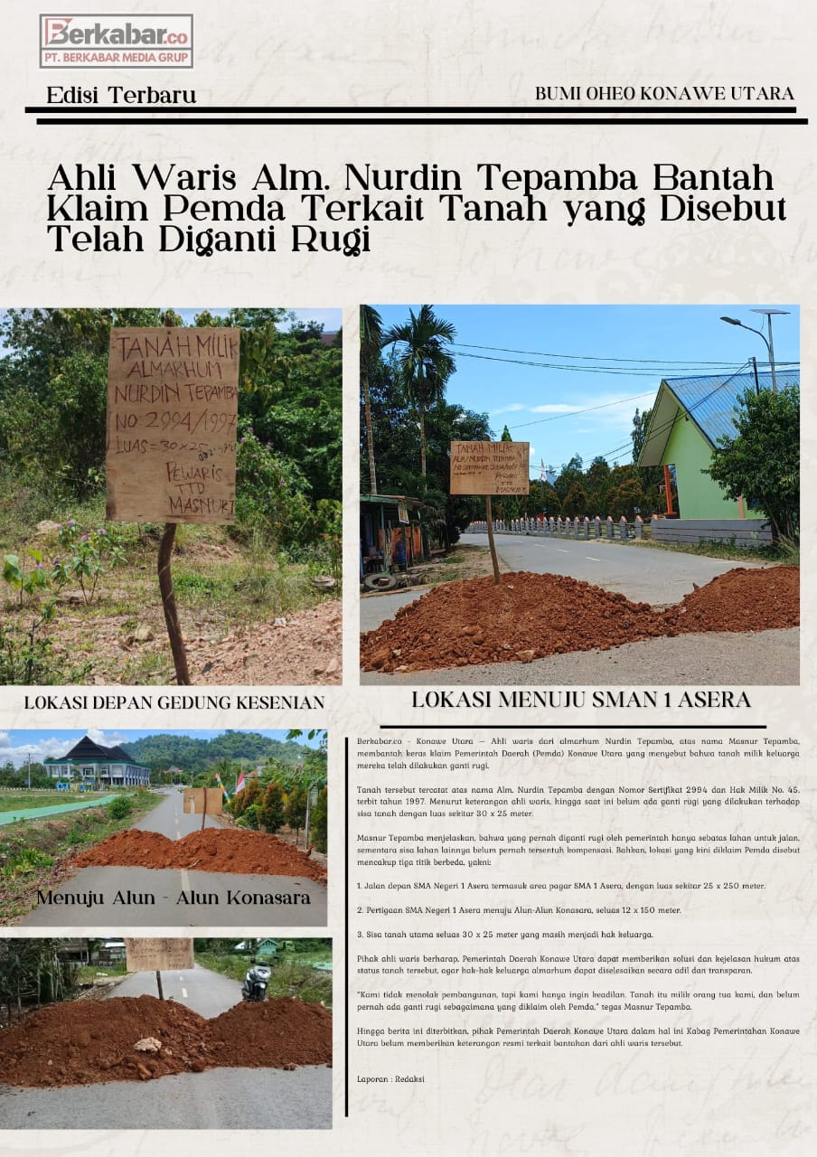 Berkabar.co – Konawe Utara – Ahli waris dari almarhum Nurdin Tepamba, atas nama Masnur Tepamba, membantah keras klaim Pemerintah Daerah (Pemda) Konawe Utara yang menyebut bahwa tanah milik keluarga mereka telah dilakukan ganti rugi.
