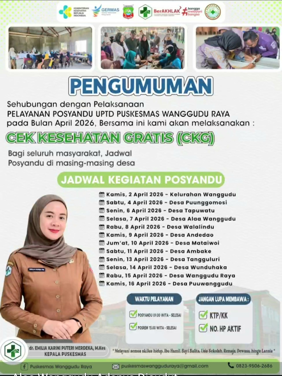 Berkabar.co – Asera – Konawe Utara. Masyarakat Kecamatan Asera diimbau untuk memanfaatkan layanan cek kesehatan gratis yang diselenggarakan melalui kegiatan Posyandu oleh UPTD Puskesmas Wanggudu Raya. Kegiatan ini tidak dipungut biaya dan terbuka untuk seluruh lapisan masyarakat.
