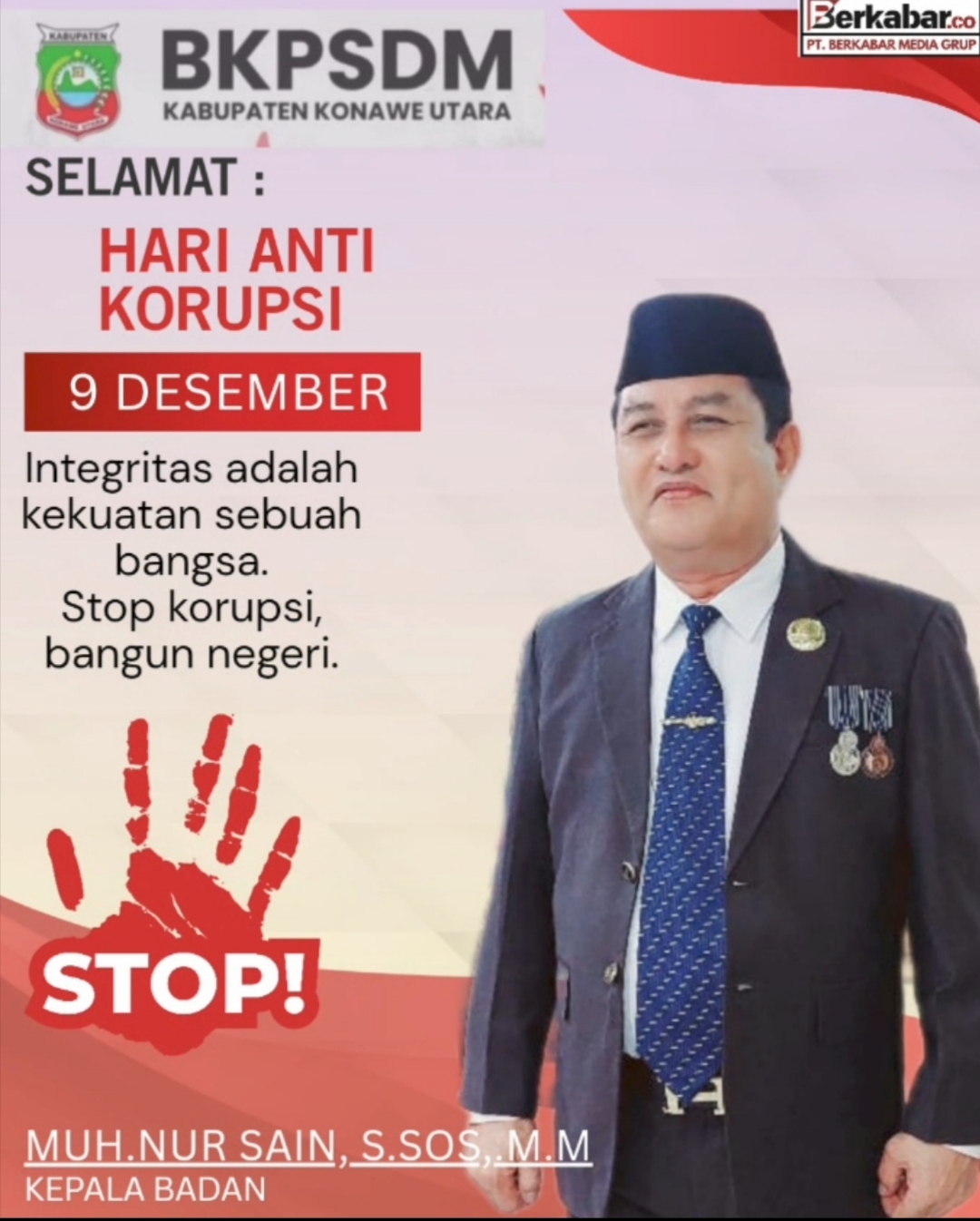 Berkabar.co – Konawe Utara. Dalam rangka memperingati Hari Antikorupsi Sedunia (Hakordia) Tahun 2025 yang jatuh pada 09 Desember 2025, Badan Kepegawaian dan Pengembangan Sumber Daya Manusia (BKPSDM) Kabupaten Konawe Utara menyampaikan komitmen kuat untuk mendukung gerakan nasional pemberantasan korupsi.