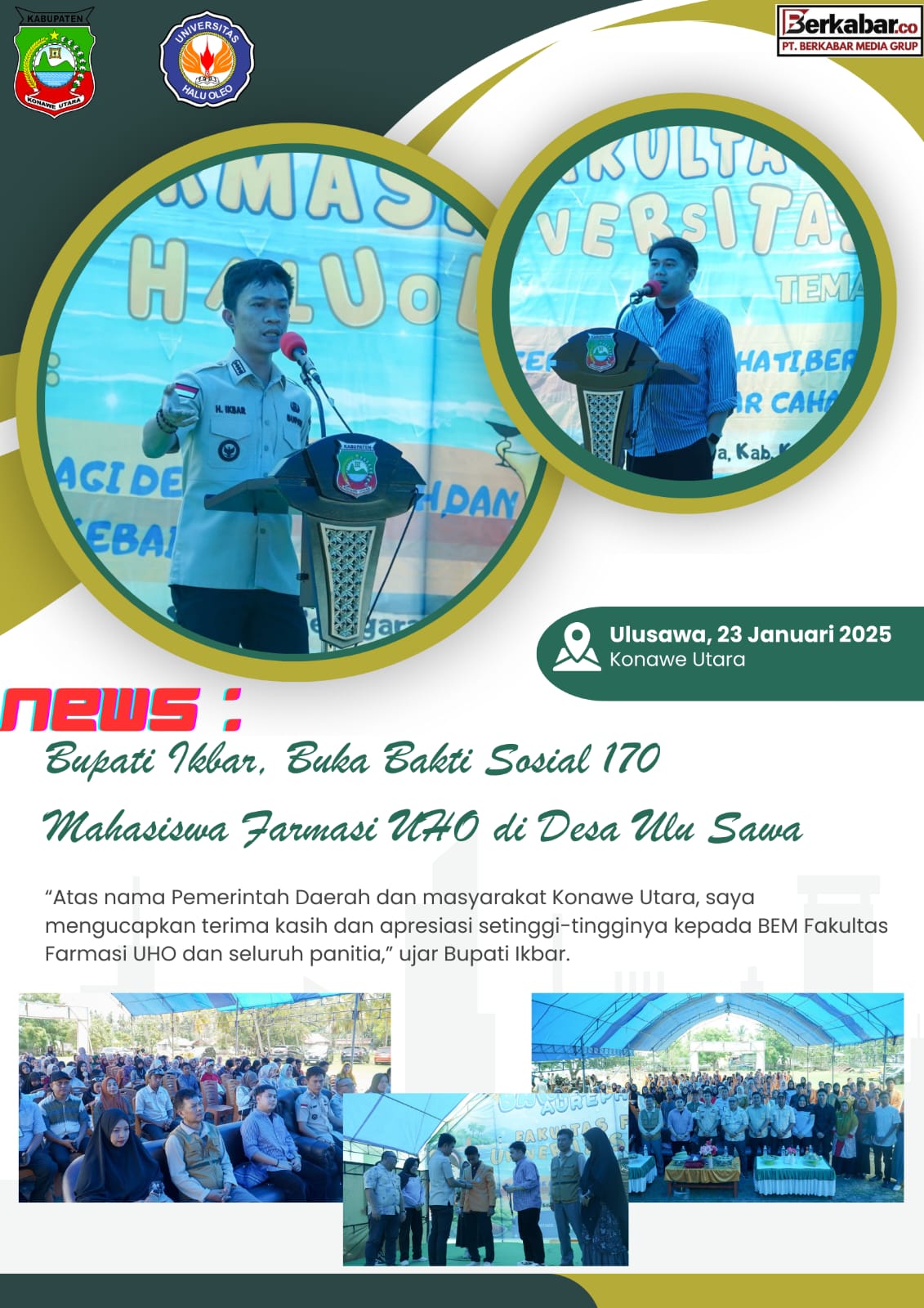 Berkabar.co – Konawe Utara. Bupati Konawe Utara, H. Ikbar, SH., MH, secara resmi membuka kegiatan bakti sosial mahasiswa Fakultas Farmasi Universitas Halu Oleo (UHO) angkatan 2024 yang digelar di Desa Ulu Sawa, Kecamatan Sawa, Jumat (23/1/2026).
