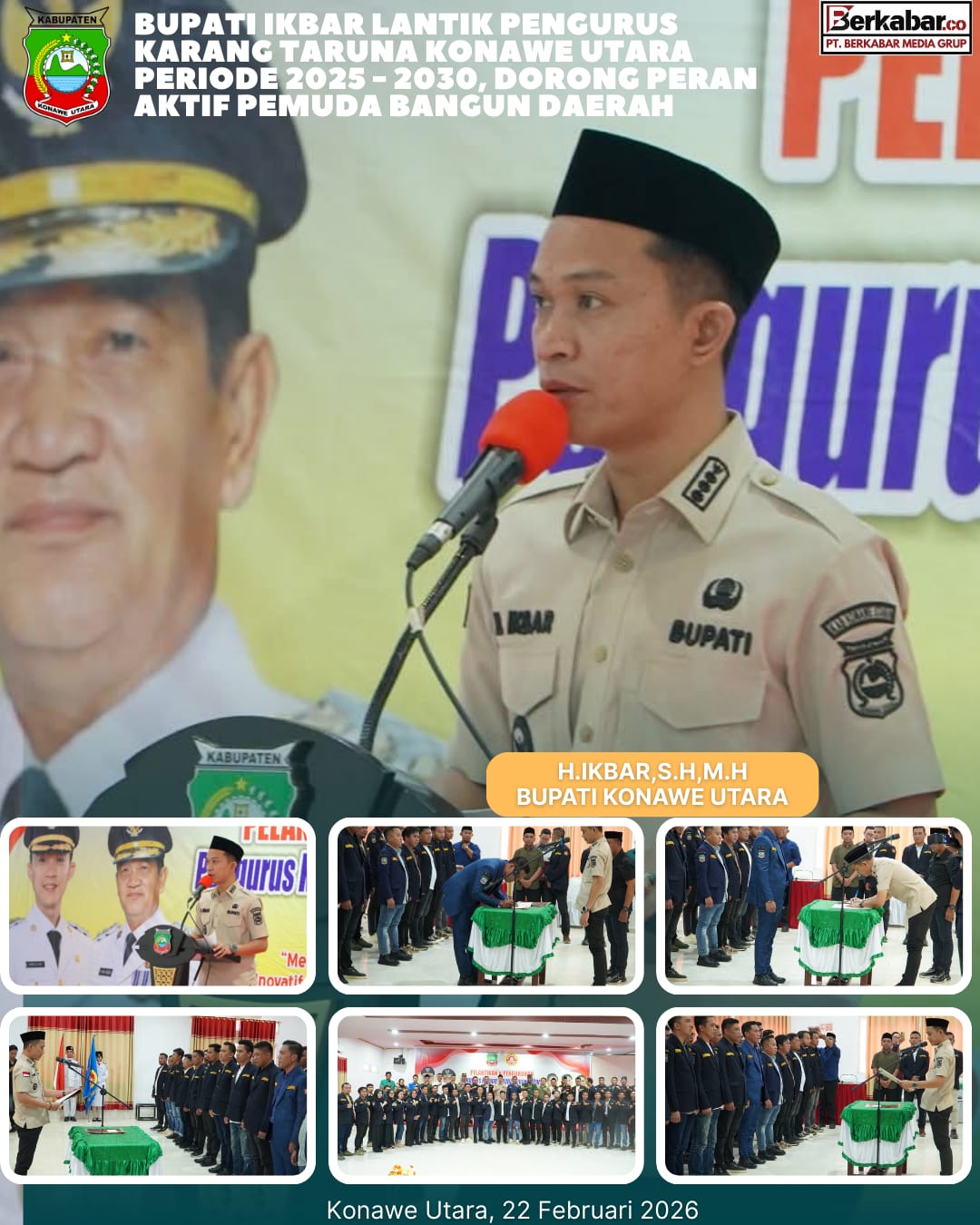 Berkabar.co – Konawe Utara. Bupati Konawe Utara H. Ikbar, S.H,. M.H secara resmi melantik Pengurus Karang Taruna Kabupaten Konawe Utara periode 2025–2030. Prosesi pelantikan berlangsung di Hotel Oheo, Minggu (22/2/2026).