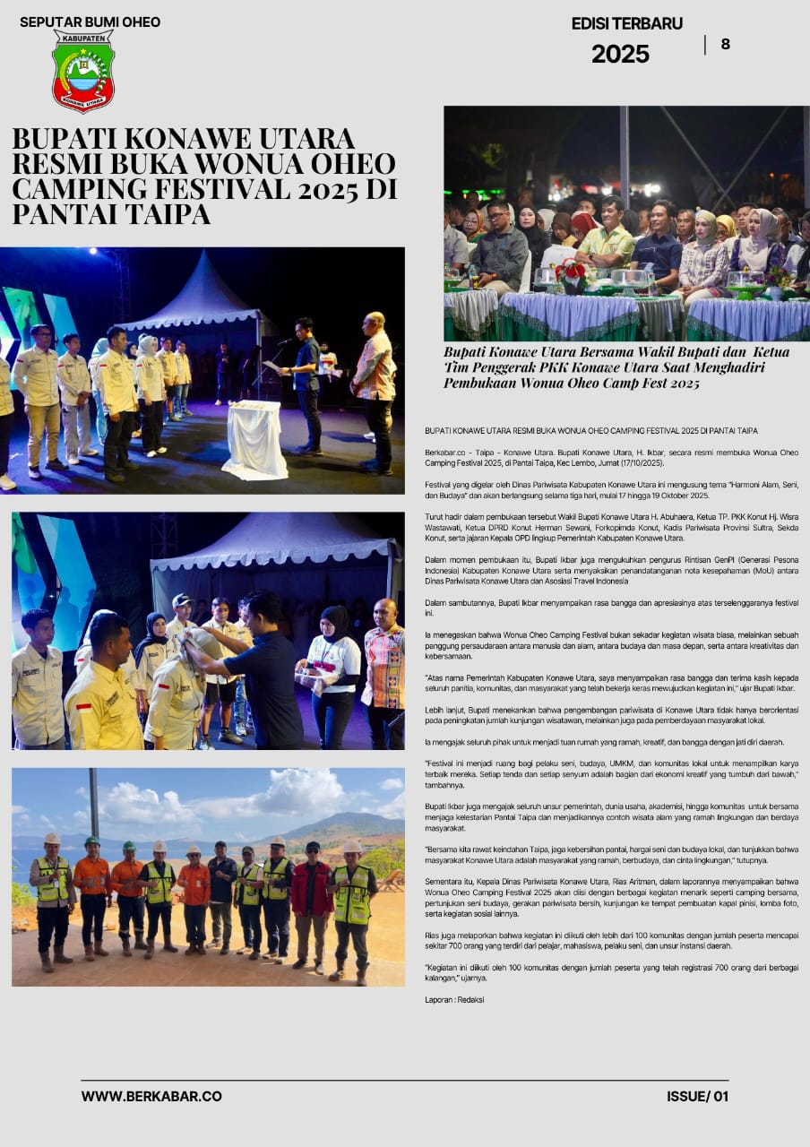Berkabar.co – Taipa – Konawe Utara. Bupati Konawe Utara, H. Ikbar, secara resmi membuka Wonua Oheo Camping Festival 2025, di Pantai Taipa, Kec Lembo, Jumat (17/10/2025).