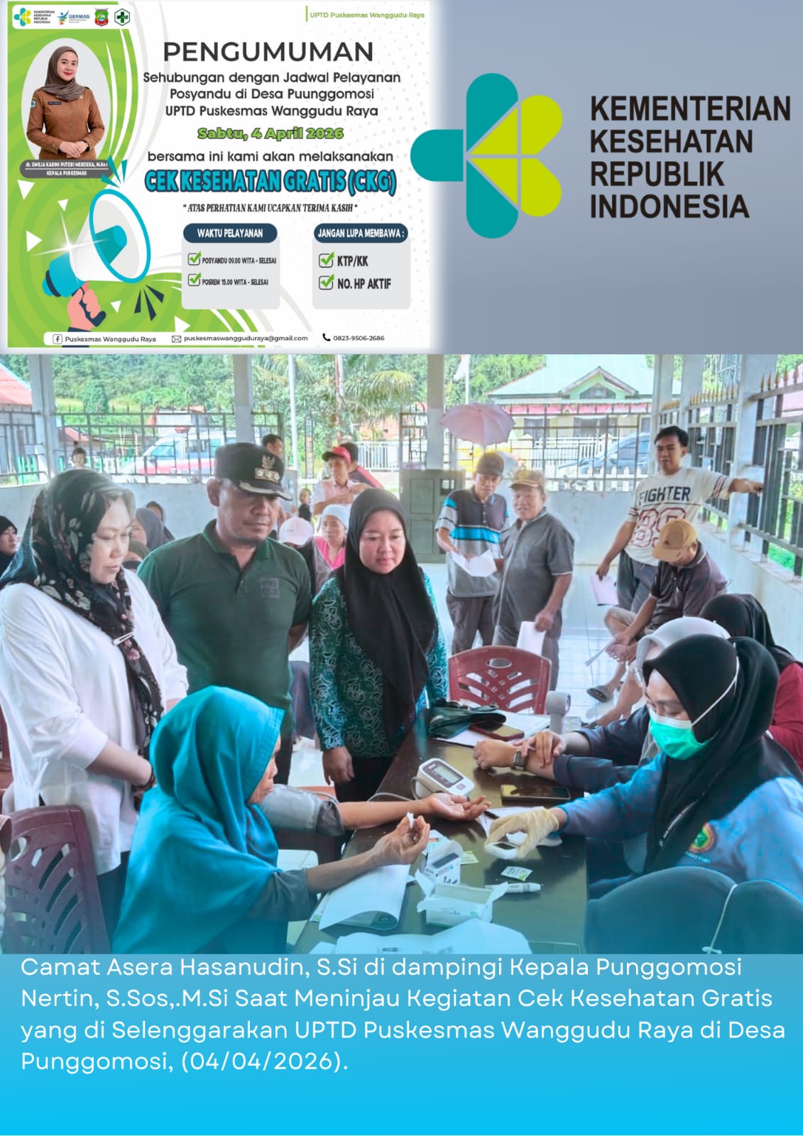 Berkabar.co – Asera – Konawe Utara. Camat Asera, Hasanudin, memantau langsung pelaksanaan kegiatan Cek Kesehatan Gratis (CKG) yang digelar oleh UPTD Puskesmas Wanggudu Raya di Desa Puunggomosi, Sabtu (4/4/2026).