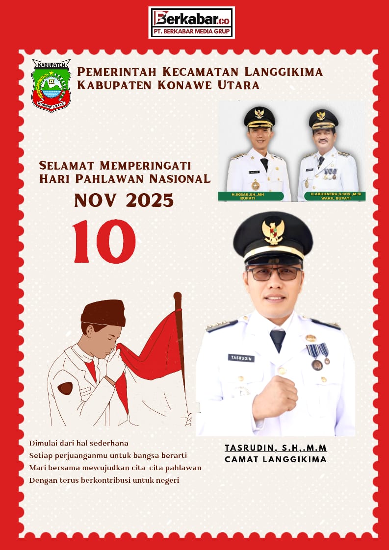 Berkabar.co – Langgikima – Konawe Utara. 10 November 2025 — Dalam rangka Peringatan Hari Pahlawan Nasional Tahun 2025, Camat Langgikima Tasrudin, S.H., M.M. mengajak seluruh masyarakat untuk menjadikan semangat perjuangan para pahlawan sebagai inspirasi dalam bekerja dan mengabdi untuk kemajuan daerah.