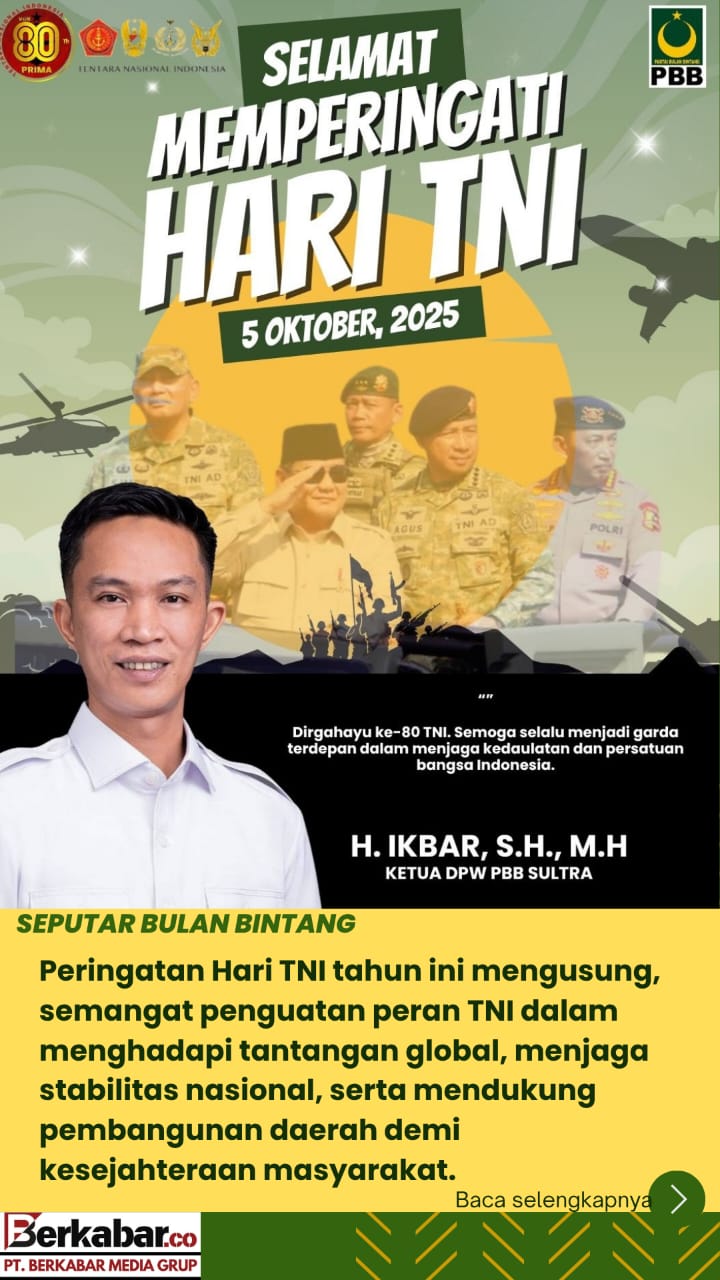Berkabar.co – Sulawesi Tenggara – Ketua Dewan Pengurus Wilayah (DPW) Partai Bulan Bintang (PBB) Provinsi Sulawesi Tenggara, H. Ikbar, S.H., M.H., menyampaikan ucapan selamat Hari Ulang Tahun ke-80 Tentara Nasional Indonesia (TNI) yang diperingati pada 5 Oktober 2025.