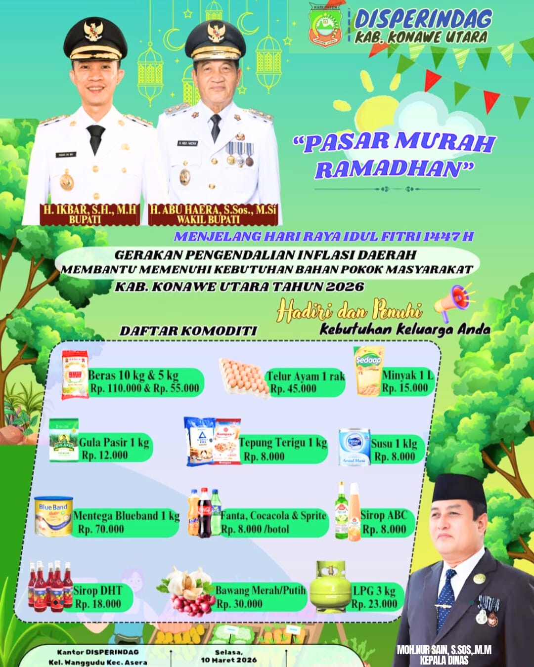 Kepala Dinas Perindustrian dan Perdagangan Kabupaten Konawe Utara, Mohamad Nur Sain, S.Sos., M.M mengatakan bahwa kegiatan pasar murah ini diharapkan dapat membantu masyarakat mendapatkan kebutuhan pokok dengan harga terjangkau sekaligus menjaga kestabilan harga di pasaran.