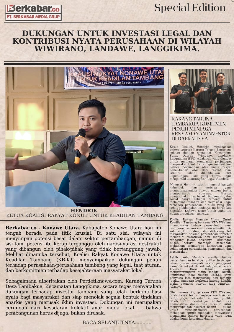 Ketua Koalisi, Hendrik, menegaskan bahwa langkah Karang Taruna Tambakua sejalan dengan semangat Konsorsium Putra Daerah Wiwirano, Landawe, Langgikima (KPD Wilalang), yang digagas untuk menjaga kemurnian perjuangan masyarakat lokal. “Kita ingin memastikan bahwa perjuangan atas nama rakyat benar-benar lahir dari rakyat lokal sendiri, bukan dikendalikan oleh kepentingan luar yang hanya ingin mengambil keuntungan,” tegas Hendrik.