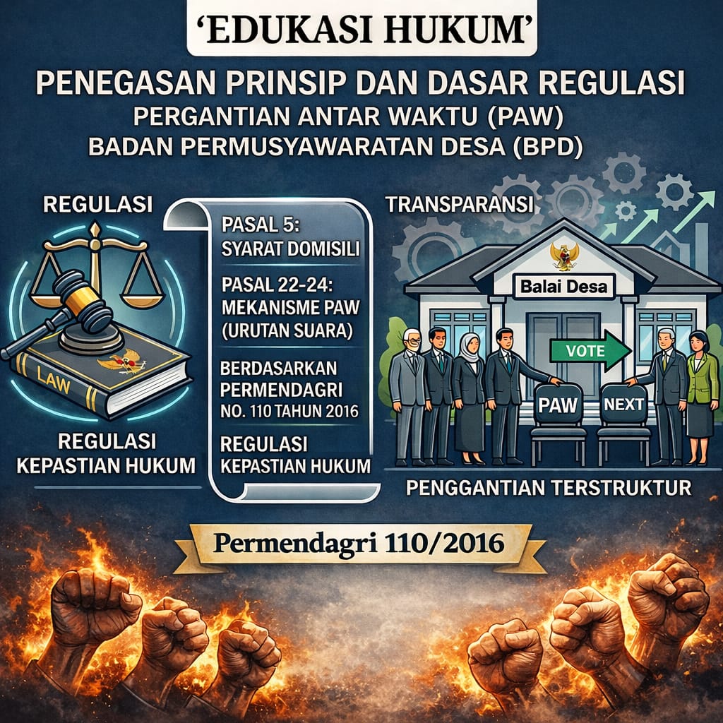 Berkabar.co – Public Legal Education. Pemahaman terhadap hukum tidak hanya berhenti pada membaca teks peraturan, tetapi juga pada kemampuan menafsirkan secara tepat sesuai dengan prinsip-prinsip hukum yang berlaku. Dalam konteks Pergantian Antar Waktu (PAW) Badan Permusyawaratan Desa (BPD), rujukan utama yang harus digunakan adalah Peraturan Menteri Dalam Negeri (Permendagri) Nomor 110 Tahun 2016 tentang BPD.
