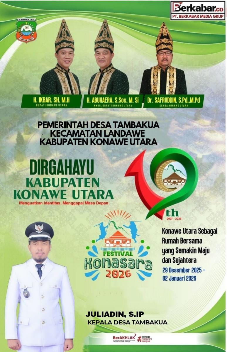 Berkabar.co – Konawe Utara. Pemerintah Desa Tambakua Kecamatan Landawe bersama seluruh elemen masyarakat menyampaikan ucapan Dirgahayu Kabupaten Konawe Utara yang ke-19 tahun. Momentum hari jadi ini diharapkan menjadi titik penguatan komitmen bersama dalam mendorong pembangunan daerah yang berkelanjutan, maju, dan sejahtera.