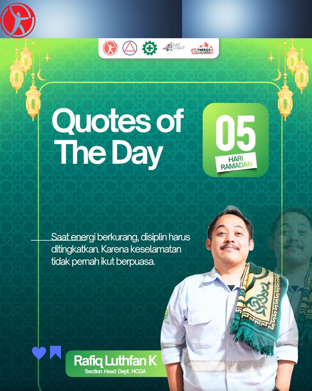 Dalam edisi kali ini, pesan disampaikan oleh Rafiq Luthfan K, Section Head Dept. HCGA. Ia mengingatkan pentingnya menjaga disiplin kerja, khususnya di bulan suci Ramadan saat kondisi fisik cenderung menurun karena berpuasa.