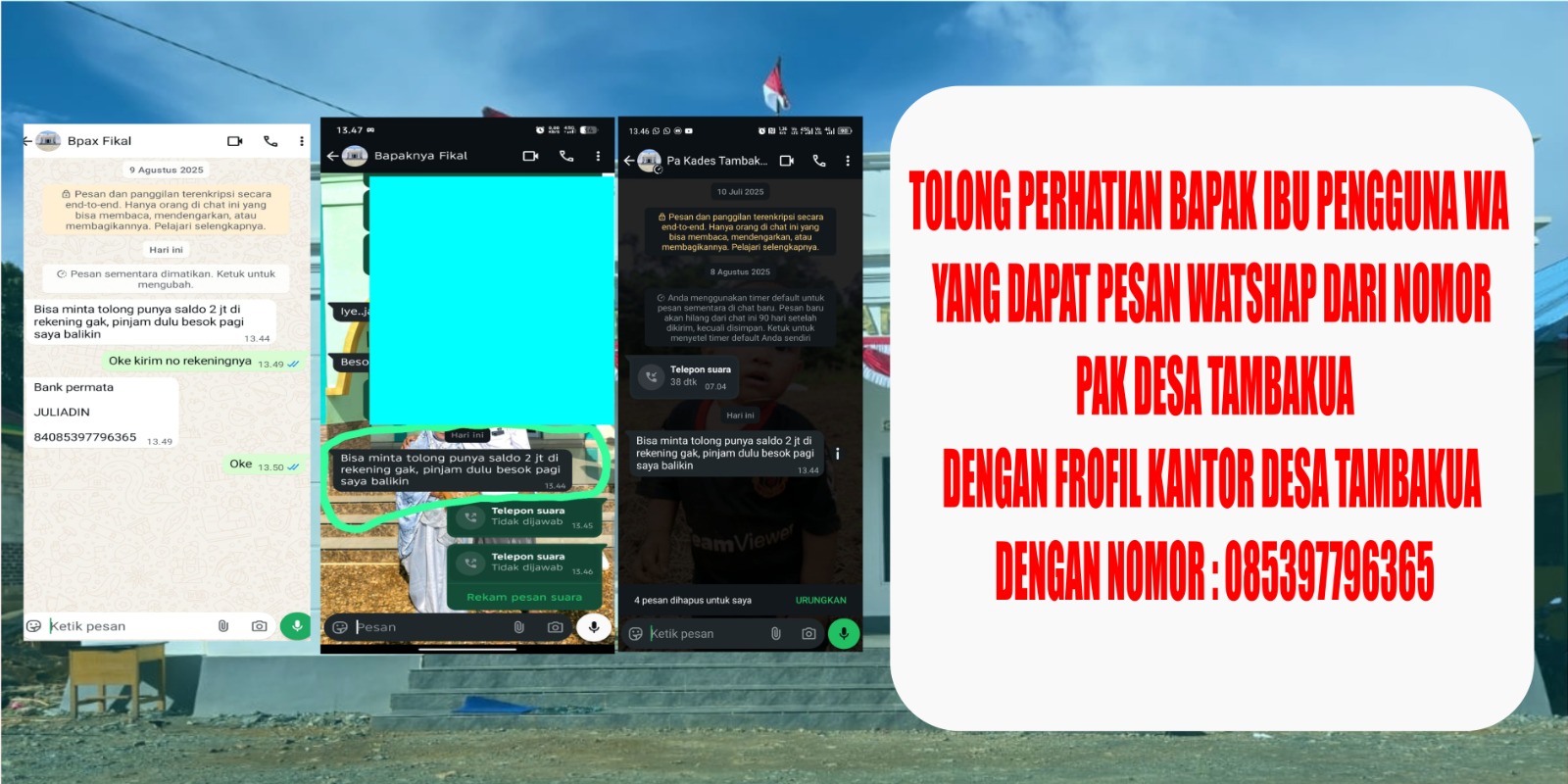 “Kami menegaskan bahwa Kepala Desa Tambakua tidak pernah meminta bantuan uang melalui WhatsApp atau media sosial apa pun. Nomor yang digunakan pelaku bukan nomor resmi kantor desa,” tegas salah satu perangkat desa Tambakua.
