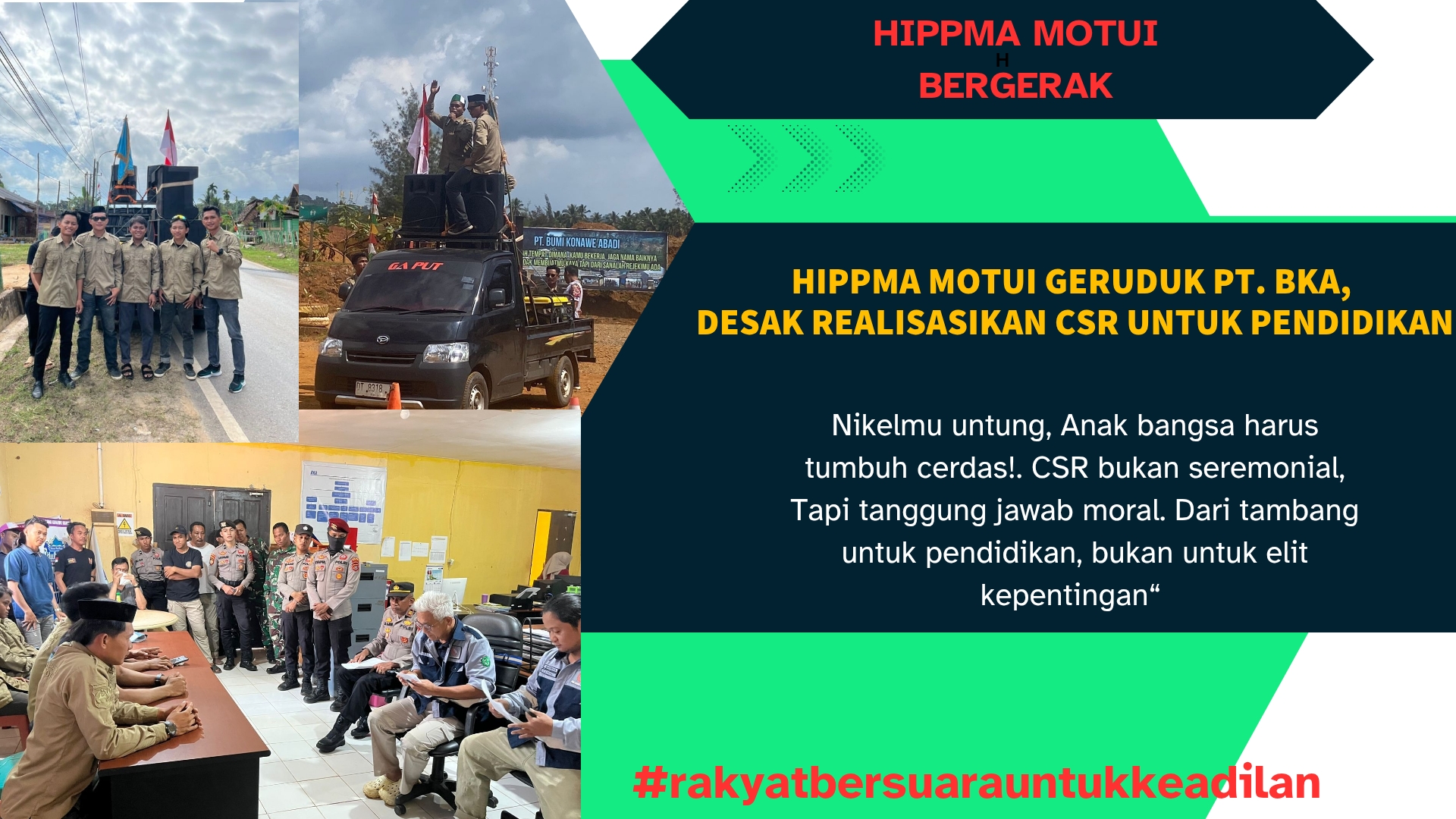 Sejumlah Pemuda & Mahasiswa yang tergabung dalam Himpunan Pemuda Pelajar Mahasiswa Kecamatan Motui (HIPPMA MOTUI) menggelar aksi demonstrasi di depan kantor operasional PT. Bumi Konawe Abadi (BKA) pada Rabu (6/8/25), menuntut perusahaan agar segera merealisasikan program CSR (Corporate Social Responbility) di bidang pendidikan untuk wilayah Kecamatan Motui, sebagai wilayah yang terdampak dari aktivitas pertambangan tersebut, sehingga hal demikian menjadi komitmen Tanggung Jawab dari perusahaan.