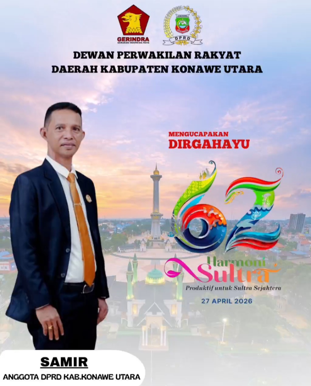 Berkabar. co – Konawe Utara. Momentum peringatan Hari Ulang Tahun (HUT) ke-62 Provinsi Sulawesi Tenggara dimanfaatkan oleh berbagai pihak untuk menyampaikan harapan dan optimisme terhadap masa depan daerah. Salah satunya datang dari Anggota DPRD Kabupaten Konawe Utara dari Partai Gerindra, Samir.