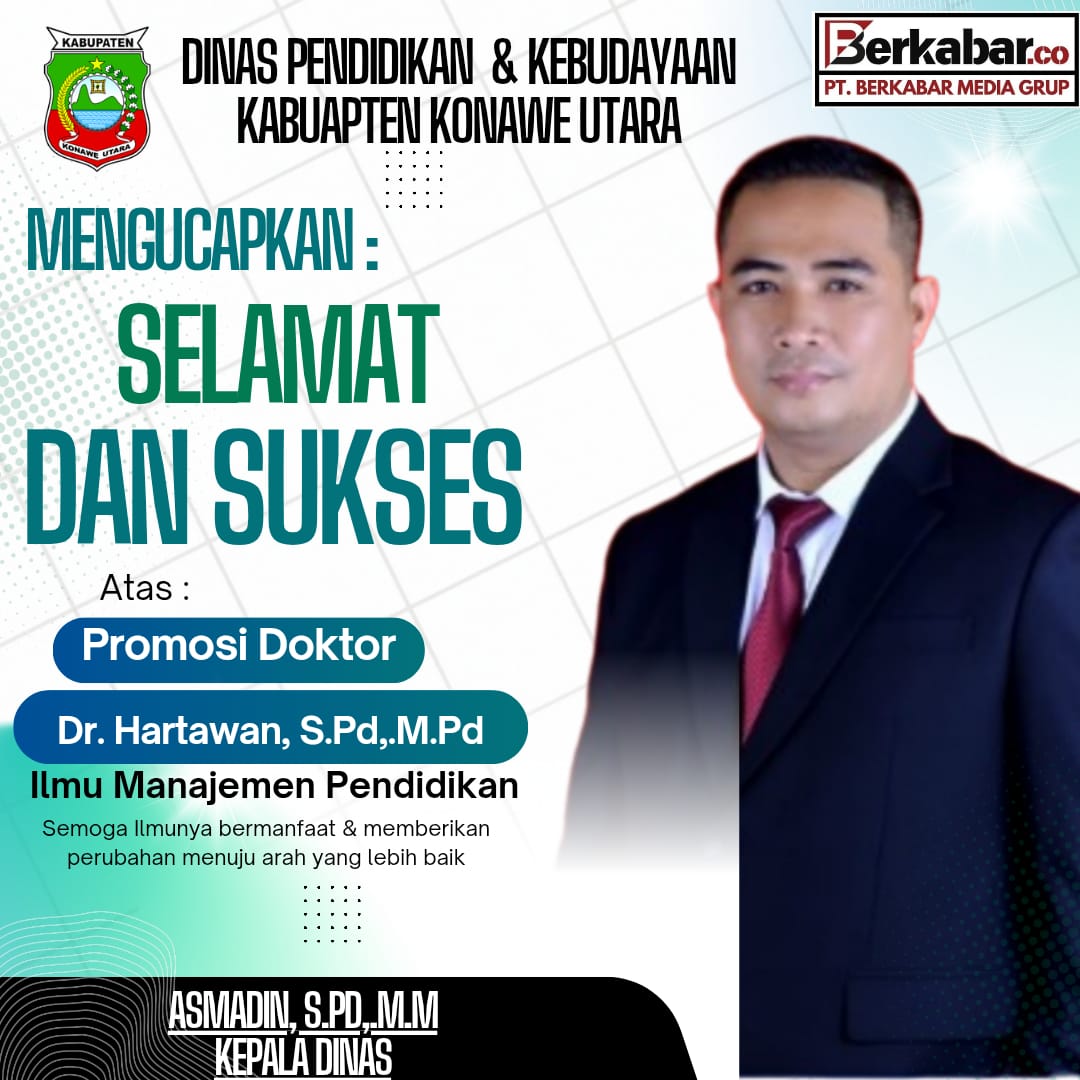 Kepala Dinas Pendidikan dan Kebudayaan Konawe Utara, Asmadin, S.Pd., M.M, turut menyampaikan apresiasi dan rasa bangganya atas keberhasilan Hartawan meraih gelar doktor.