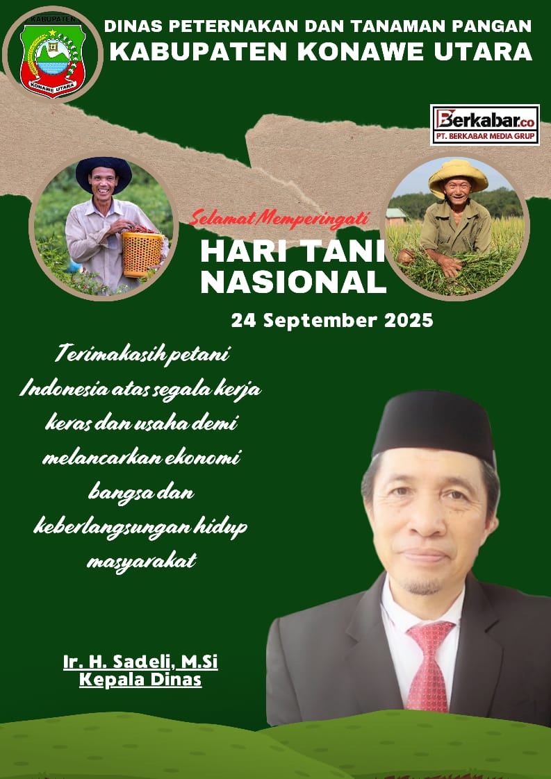 Berkabar.co – Konawe Utara – Memperingati momentum Hari Tani Nasional yang jatuh pada tanggal 24 September 2025, Kepala Dinas Peternakan dan Tanaman Pangan Kabupaten Konawe Utara, Ir. H. Sadeli, M.Si, menyampaikan ucapan selamat sekaligus harapan besar kepada seluruh petani Indonesia, khususnya petani di wilayah Konawe Utara.
