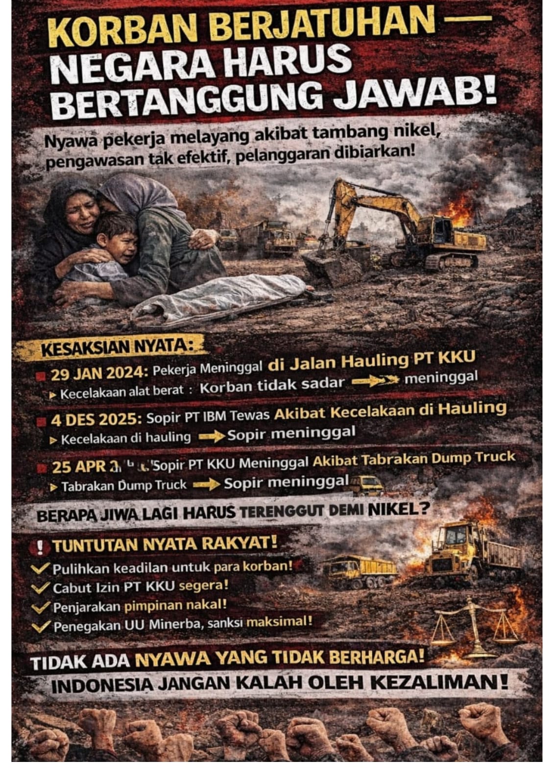 “Nyawa pekerja bukan biaya produksi. Negara wajib hadir dan hukum harus ditegakkan tanpa pandang bulu,” demikian pernyataan sikap yang disampaikan perwakilan masyarakat Konawe Utara.