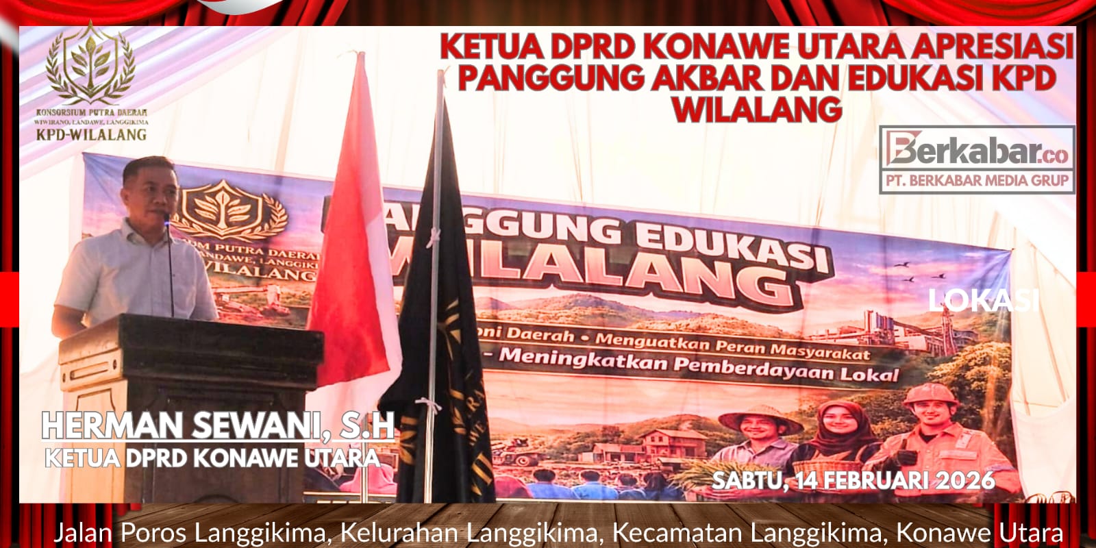 Berkabar.co – Langgikima – Konawe Utara. Ketua DPRD Kabupaten Konawe Utara, Herman Sewani, S.H., menghadiri dan memberikan sambutan dalam rangkaian kegiatan Panggung Akbar dan Panggung Edukasi KPD Wilalang yang digelar di Lapangan Kelurahan Langgikima, Sabtu (14 Februari 2026).
