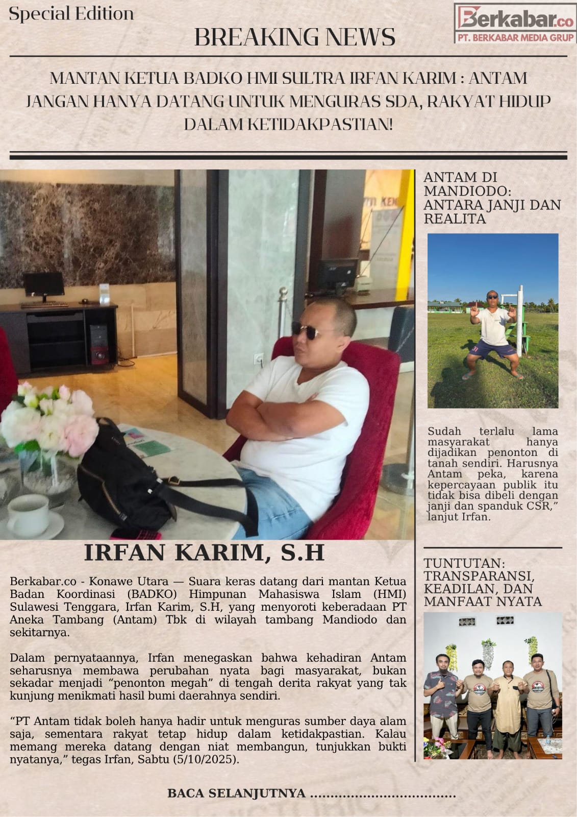 “PT Antam tidak boleh hanya hadir untuk menguras sumber daya alam saja, sementara rakyat tetap hidup dalam ketidakpastian. Kalau memang mereka datang dengan niat membangun, tunjukkan bukti nyatanya,” tegas Irfan, Sabtu (5/10/2025).