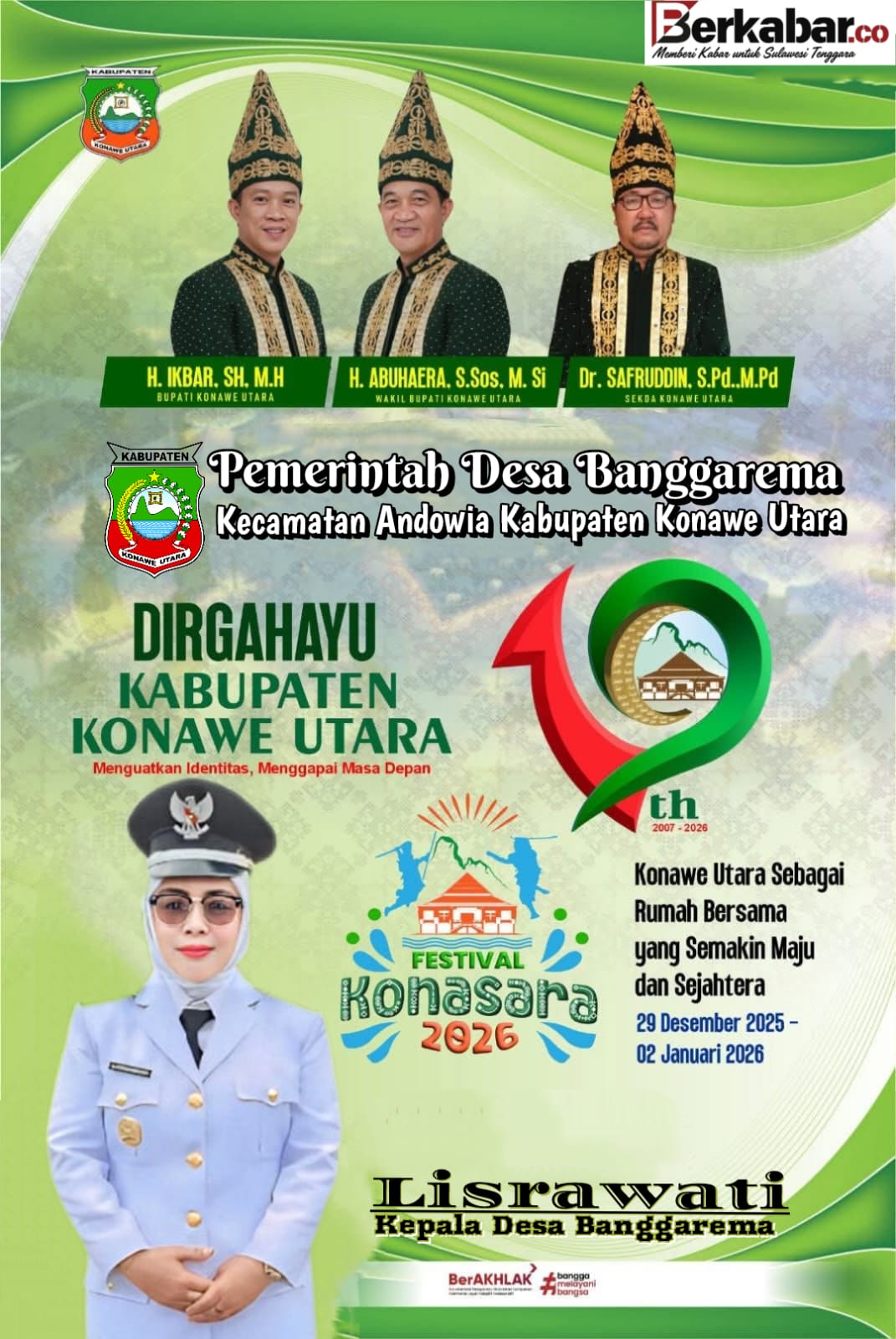 “Kami pemerintah dan masyarakat Desa Banggarema berharap di usia Konawe Utara yang ke-19 tahun ini, seluruh program yang tertuang dalam visi misi Konasara Jilid III dapat berjalan dengan baik dan memberikan manfaat nyata bagi masyarakat,” ujar Lisrawati.