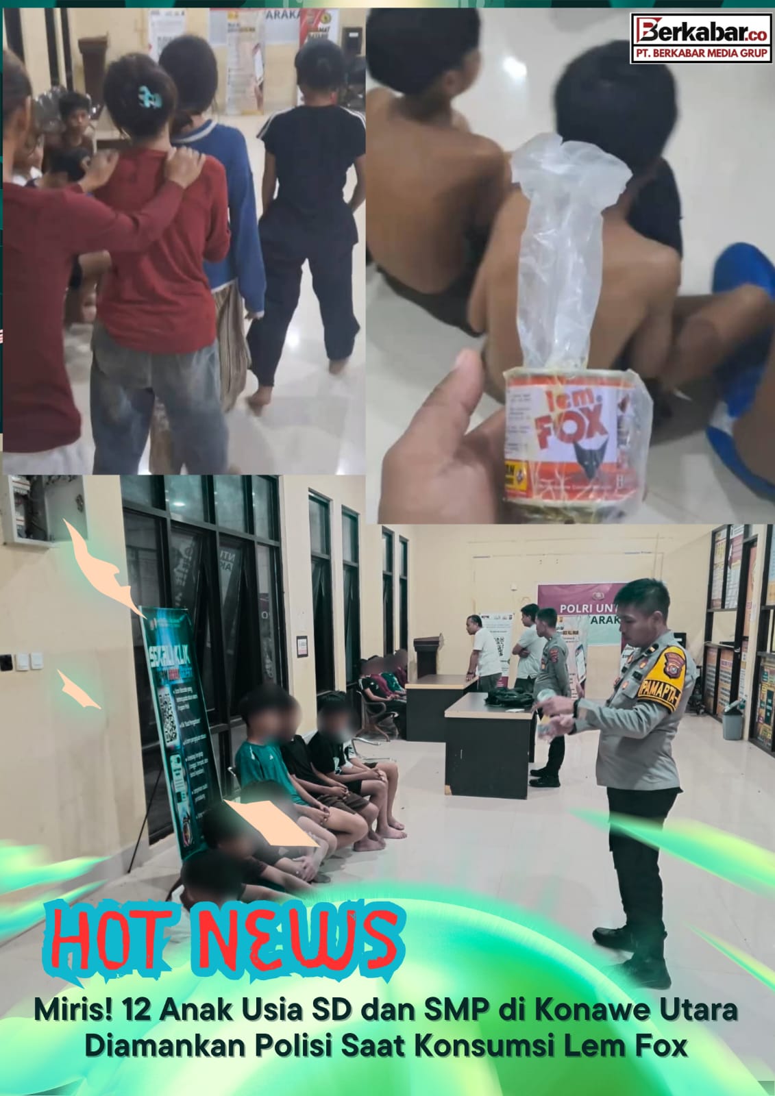 Berkabar.co – Konawe Utara. Sebanyak 12 orang anak remaja yang masih berstatus pelajar Sekolah Dasar (SD) dan Sekolah Menengah Pertama (SMP) di Kabupaten Konawe Utara diamankan oleh pihak kepolisian karena kedapatan mengonsumsi lem Fox, yang diduga digunakan sebagai bahan untuk ngelem (menghirup lem) demi mendapatkan efek mabuk.