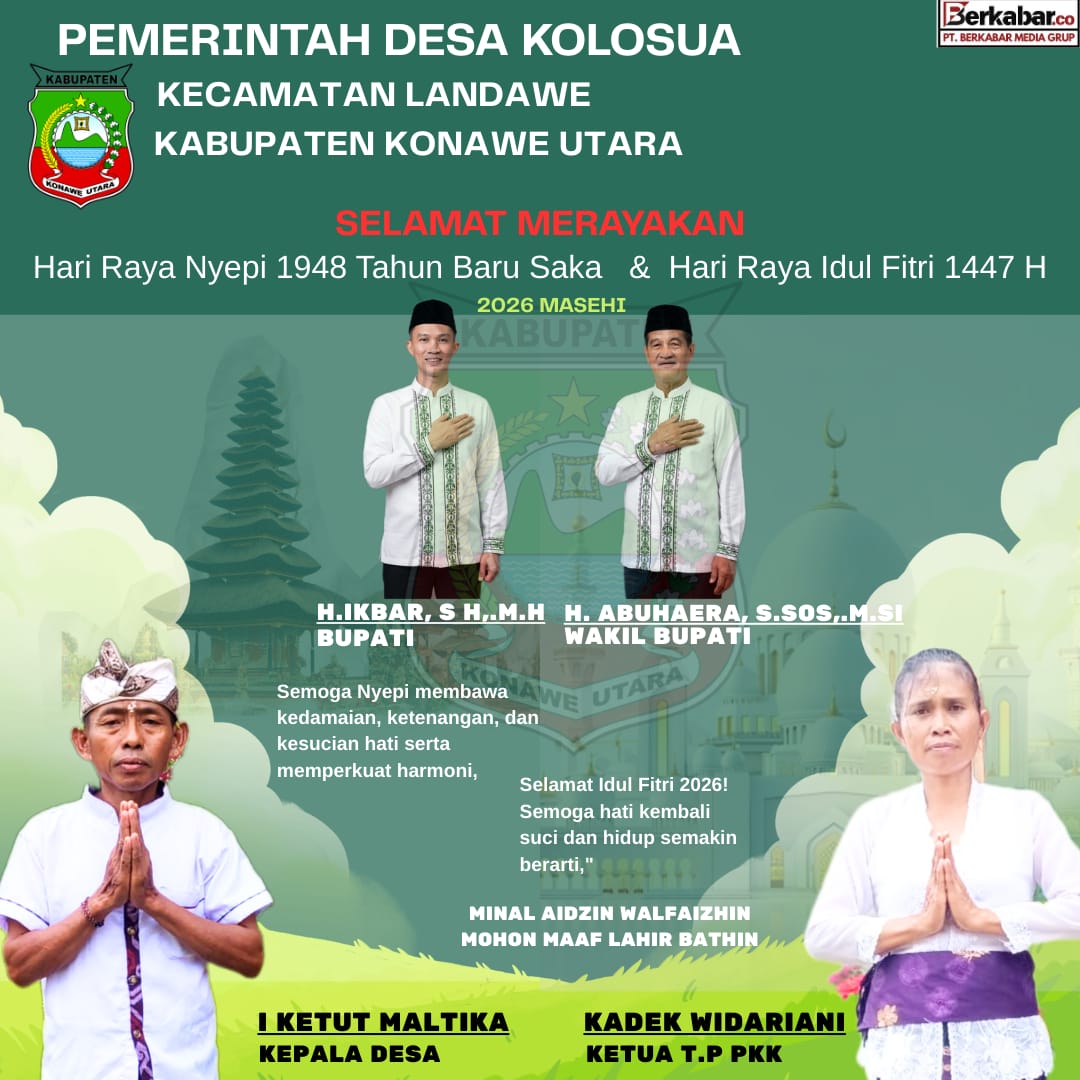 Berkabar.co – Konawe Utara. Pemerintah Desa Kolosua, Kecamatan Landawe, Kabupaten Konawe Utara, memanfaatkan momentum perayaan Hari Raya Nyepi Tahun Baru Saka 1948 dan Hari Raya Idulfitri 1447 Hijriah tahun 2026 Masehi untuk memperkuat kerukunan dan toleransi antarumat beragama di tengah masyarakat.