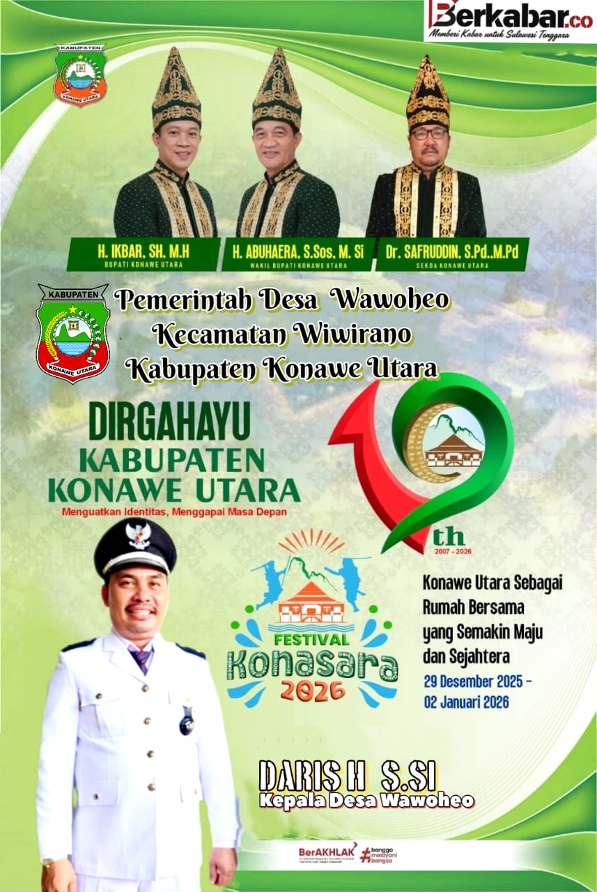 Sejalan dengan tema “Menguatkan Identitas, Menggapai Masa Depan”, masyarakat Desa Wawoheo berharap Kabupaten Konawe Utara benar-benar menjadi rumah bersama yang semakin maju dan sejahtera, sebagaimana semangat yang diusung dalam rangkaian Festival Konasara 2026 yang akan digelar pada 29 Desember 2025 hingga 2 Januari 2026.