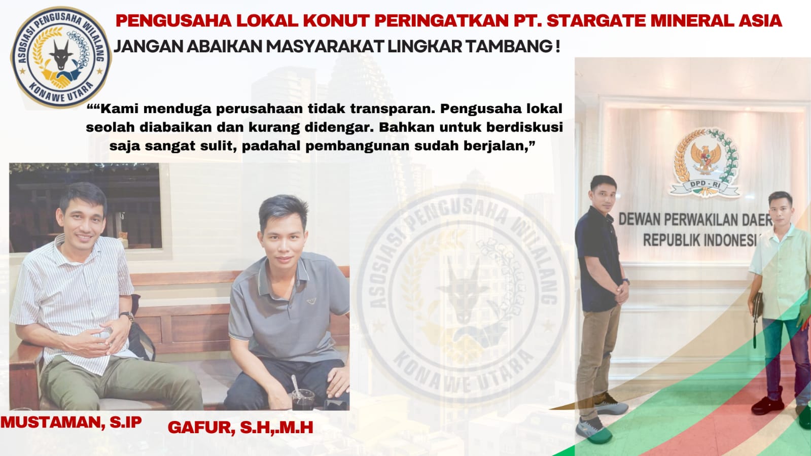 Gafur, SH., MH., mantan Ketua Umum Forum Pascasarjana Konawe Utara Jakarta sekaligus Ketua Umum Asosiasi Pengusaha Wilalang Kabupaten Konawe Utara, menegaskan agar PT Stargate Mineral Asia tidak mengabaikan peran pengusaha lokal dalam proses pembangunan smelter.