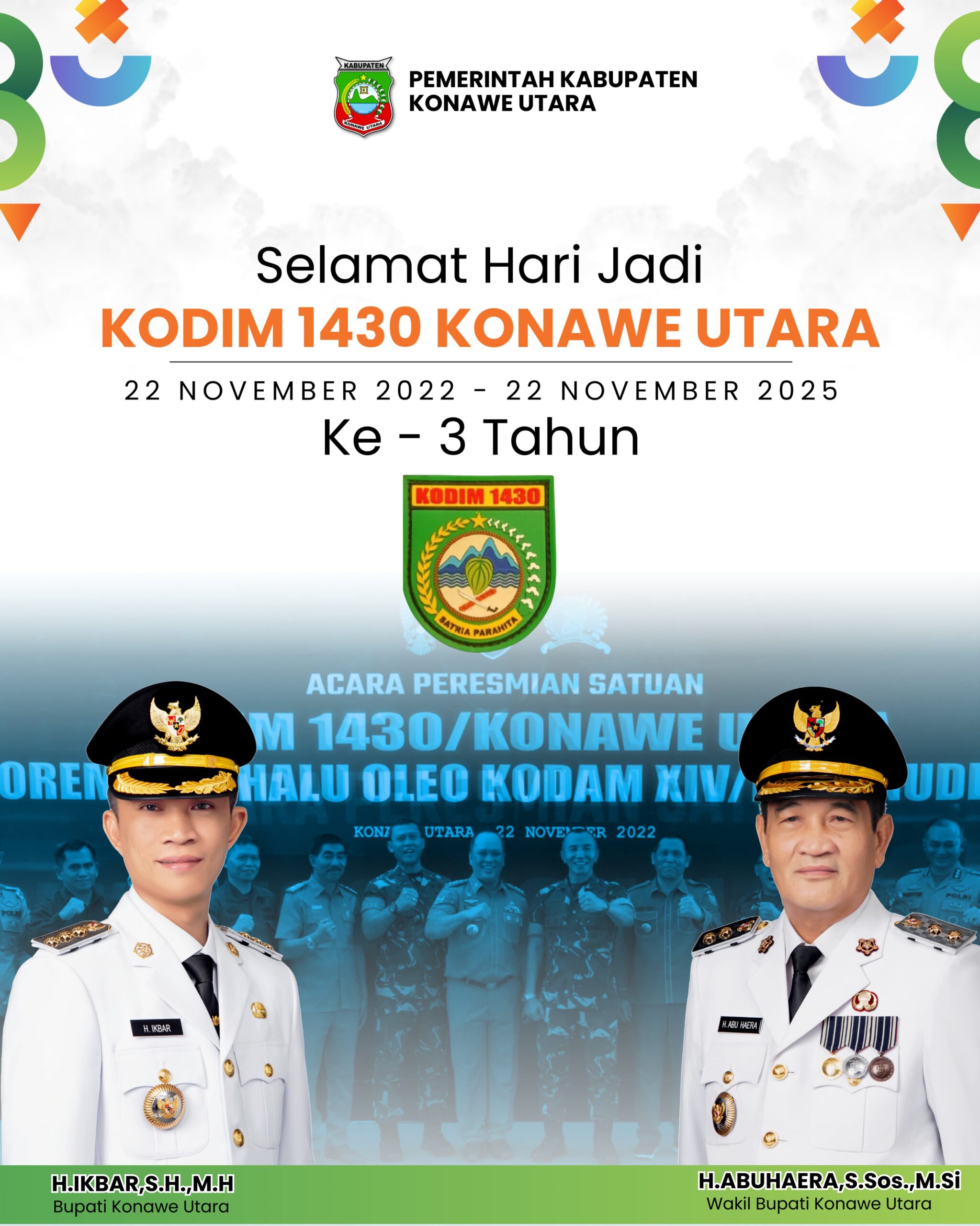 “Atas nama Pemerintah Kabupaten Konawe Utara, kami menyampaikan selamat Hari Jadi Kodim 1430 Konawe Utara yang ke-3. Semoga Kodim semakin profesional, responsif, dan terus memperkuat sinergi dengan pemerintah daerah dalam mewujudkan keamanan dan kesejahteraan masyarakat,” ujar Bupati.