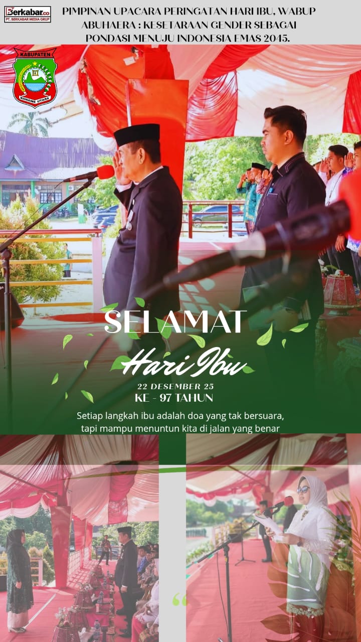 Berkabar.co – Konawe Utara. Wakil Bupati Konawe Utara H. Abuhaera, S. Sos.,M. Si., menjadi Inspektur Upacara pada peringatan ke – 97 Tahun Hari Ibu tingkat Kabupaten Konawe Utara. Senin, 21 Desember 2025.