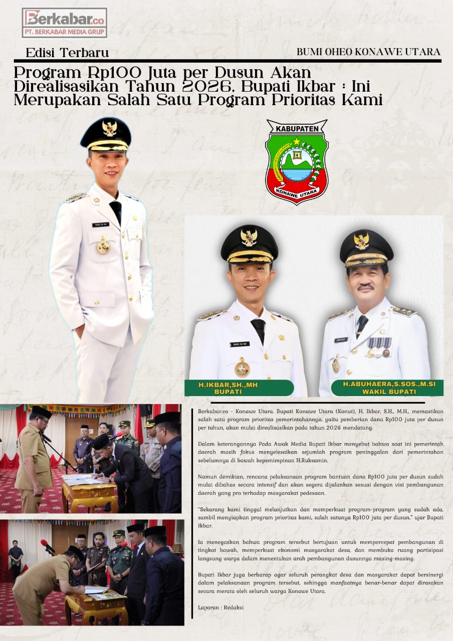 Berkabar.co – Konawe Utara. Bupati Konawe Utara (Konut), H. Ikbar, S.H., M.H., memastikan salah satu program prioritas pemerintahannya, yaitu pemberian dana Rp100 juta per dusun per tahun, akan mulai direalisasikan pada tahun 2026 mendatang.