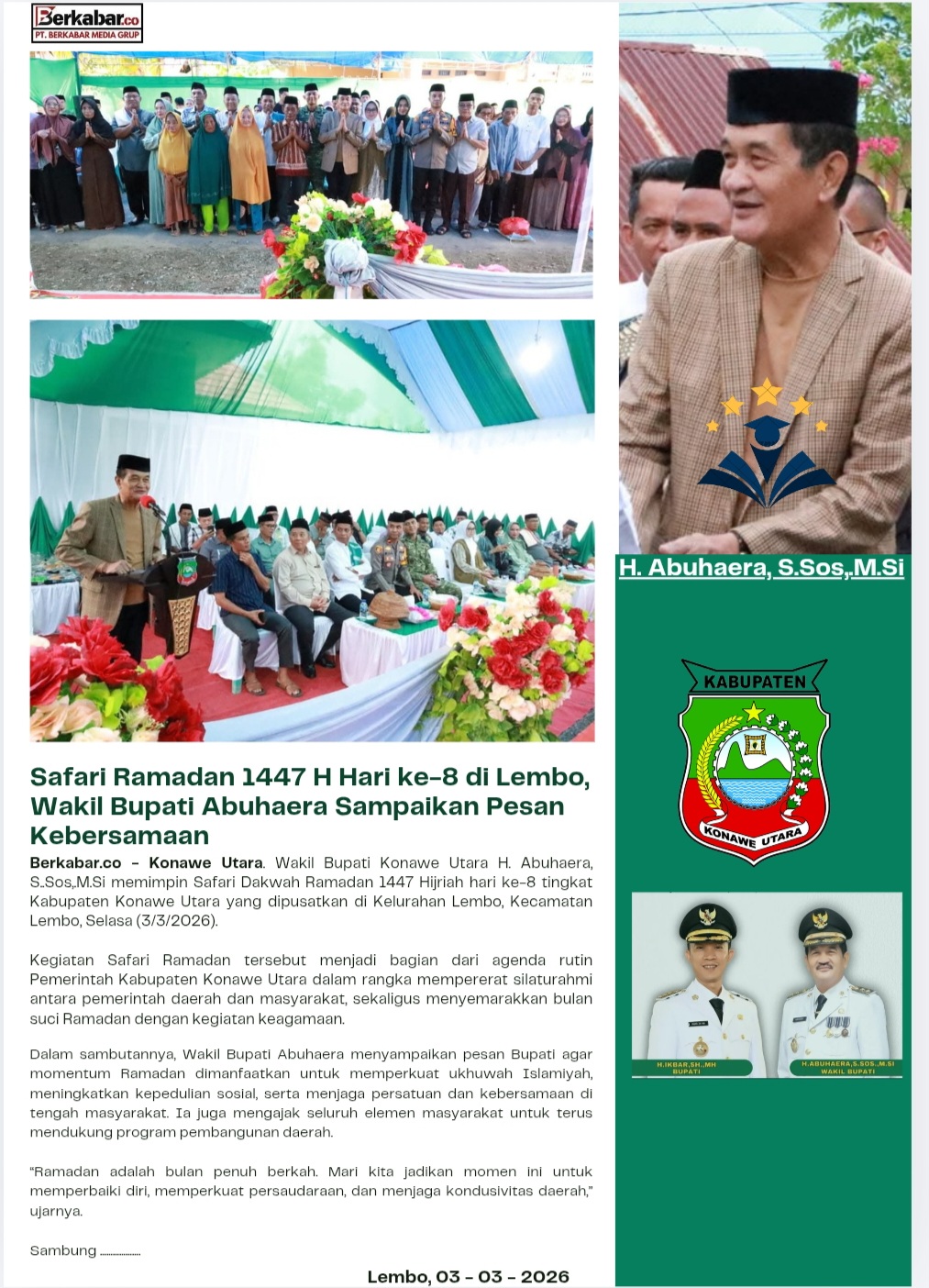 Berkabar.co – Konawe Utara. Wakil Bupati Konawe Utara H. Abuhaera, S..Sos,.M.Si memimpin Safari Dakwah Ramadan 1447 Hijriah hari ke-8 tingkat Kabupaten Konawe Utara yang dipusatkan di Kelurahan Lembo, Kecamatan Lembo, Selasa (3/3/2026).