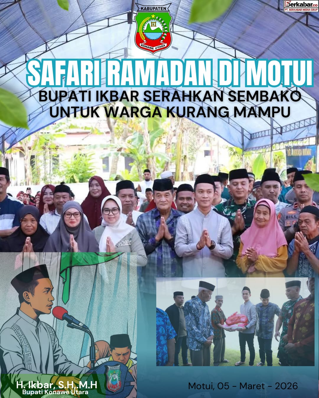 Berkabar.co – Konawe Utara – Bupati Konawe Utara, H. Ikbar, SH., MH., bersama Wakil Bupati Konawe Utara, H. Abuhaera, S.Sos., M.Si., melaksanakan kegiatan Safari Ramadan 1447 H/2026 M yang kali ini dipusatkan di Kecamatan Motui, tepatnya di Desa Ranombupulu, Kamis (5/3/2026).