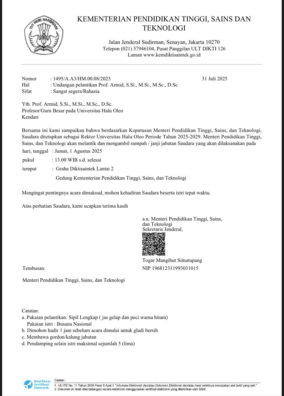 Surat itu menyatakan bahwa berdasarkan keputusan Mendiktisaintek, Prof. Brian Yuliarto, S.T., M.Eng., Ph.D., Prof. Armid akan dilantik sebagai Rektor UHO menggantikan pejabat sebelumnya.