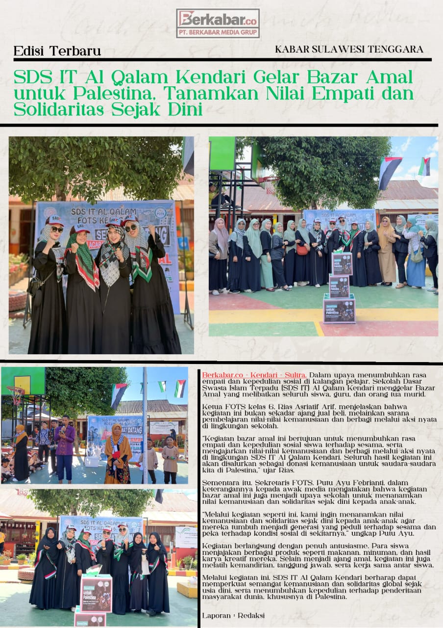 Berkabar.co – Kendari – Sultra. Dalam upaya menumbuhkan rasa empati dan kepedulian sosial di kalangan pelajar, Sekolah Dasar Swasta Islam Terpadu (SDS IT) Al Qalam Kendari menggelar Bazar Amal yang melibatkan seluruh siswa, guru, dan orang tua murid.
