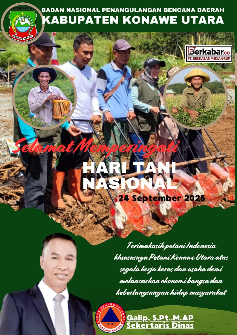 Berkabar.co – Konawe Utara – Dalam rangka menyambut Hari Tani Nasional yang jatuh pada 24 September 2025, Sekretaris Dinas (Sekdis) Badan Nasional Penanggulangan Bencana (BNPB) Kabupaten Konawe Utara, Galip, S.Pt., M.AP, menyampaikan dorongan penuh terhadap peningkatan kesejahteraan petani Indonesia, khususnya para petani yang berada di wilayah Bumi Oheo, Konawe Utara.