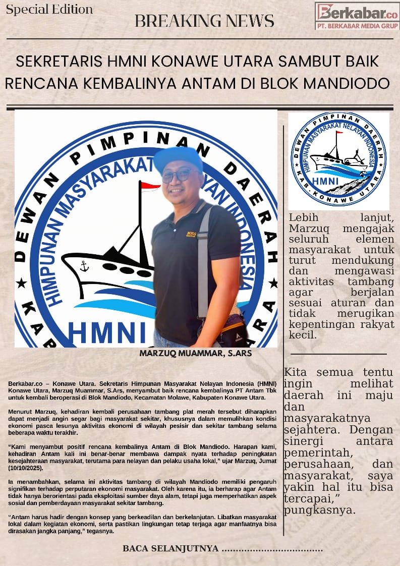Berkabar.co – Konawe Utara. Sekretaris Himpunan Masyarakat Nelayan Indonesia (HMNI) Konawe Utara, Marzuq Muammar, S.Ars, menyambut baik rencana kembalinya PT Antam Tbk untuk kembali beroperasi di Blok Mandiodo, Kecamatan Molawe, Kabupaten Konawe Utara.