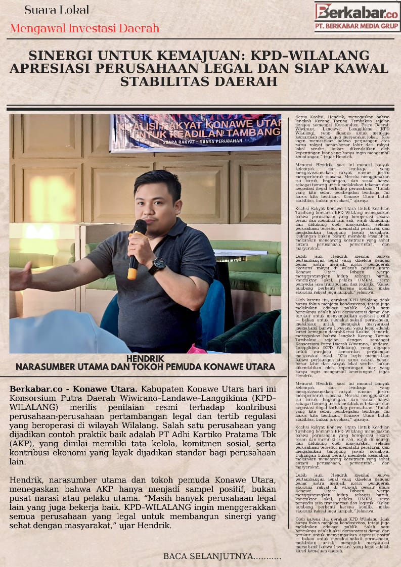 Berkabar.co – Konawe Utara. Konsorsium Putra Daerah Wiwirano–Landawe–Langgikima (KPD–WILALANG) merilis penilaian resmi terhadap kontribusi perusahaan-perusahaan pertambangan legal dan tertib regulasi yang beroperasi di wilayah Wilalang. Salah satu perusahaan yang dijadikan contoh praktik baik adalah PT Adhi Kartiko Pratama Tbk (AKP), yang dinilai memiliki tata kelola, komitmen sosial, serta kontribusi ekonomi yang layak dijadikan standar bagi perusahaan lain.