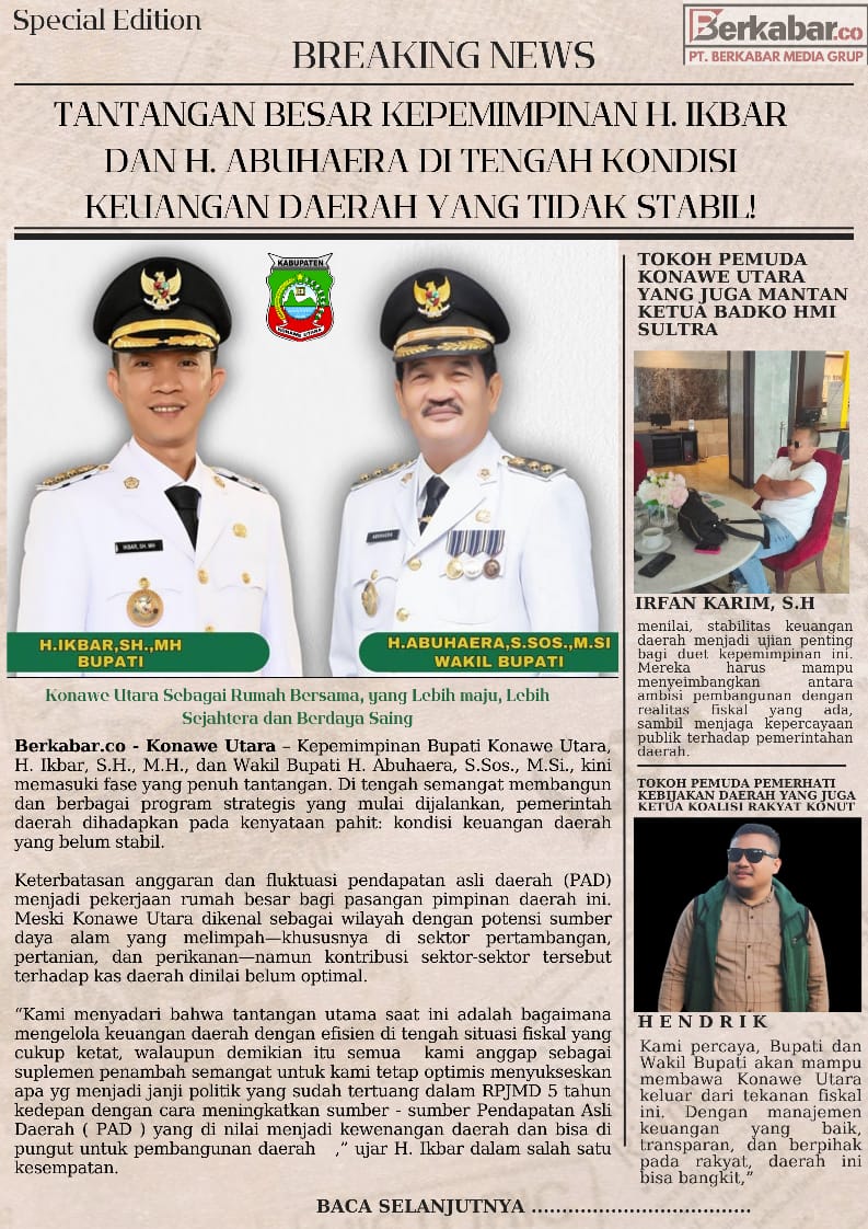 Berkabar.co – Konawe Utara – Kepemimpinan Bupati Konawe Utara, H. Ikbar, S.H., M.H., dan Wakil Bupati H. Abuhaera, S.Sos., M.Si., kini memasuki fase yang penuh tantangan. Di tengah semangat membangun dan berbagai program strategis yang mulai dijalankan, pemerintah daerah dihadapkan pada kenyataan pahit: kondisi keuangan daerah yang belum stabil.