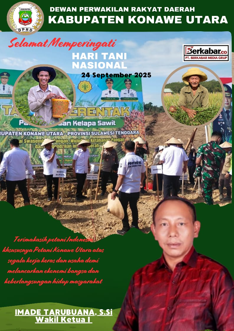 Berkabar.co – Konawe Utara – Wakil Ketua I Dewan Perwakilan Rakyat Daerah (DPRD) Kabupaten Konawe Utara, Imade Tarubuana, S.Si, menyampaikan harapan besarnya pada peringatan Hari Tani Nasional yang jatuh pada 24 September 2025. Menurutnya, momentum ini harus menjadi titik kebangkitan serta pembakar semangat bagi seluruh petani di Kabupaten Konawe Utara untuk terus berjuang meningkatkan taraf hidup, kesejahteraan, dan kemajuan sektor pertanian.